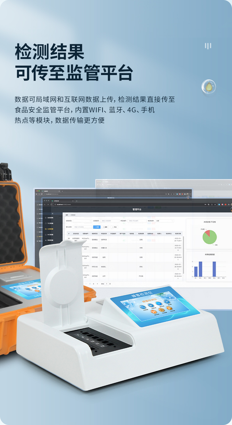8、儀器帶有監管平台。數據可局域網和互聯網數據上傳,水蜜桃在线视频結果直接傳至食品安全監管平台。進行區域食品安全監管及大數據分析處理,水蜜桃在线视频區域食品安全長短期動態,達到食品安全問題預估、預警。